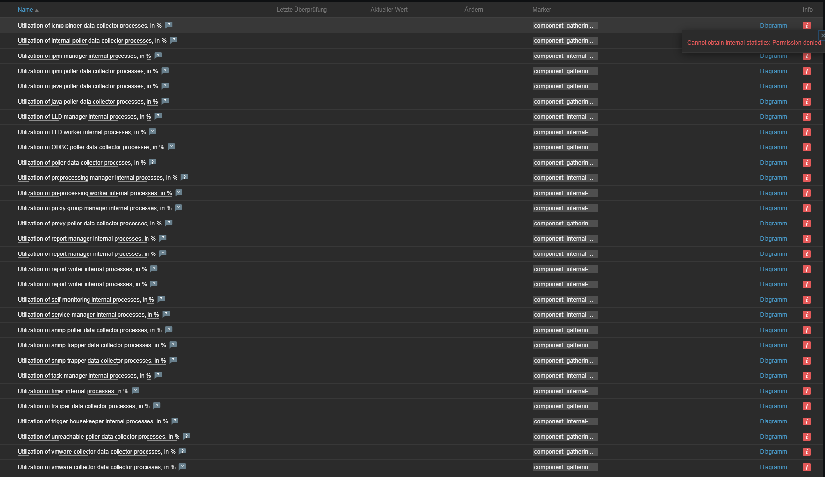 Some of the items have the status "Cannot obtain internal statistics: Permission denied"