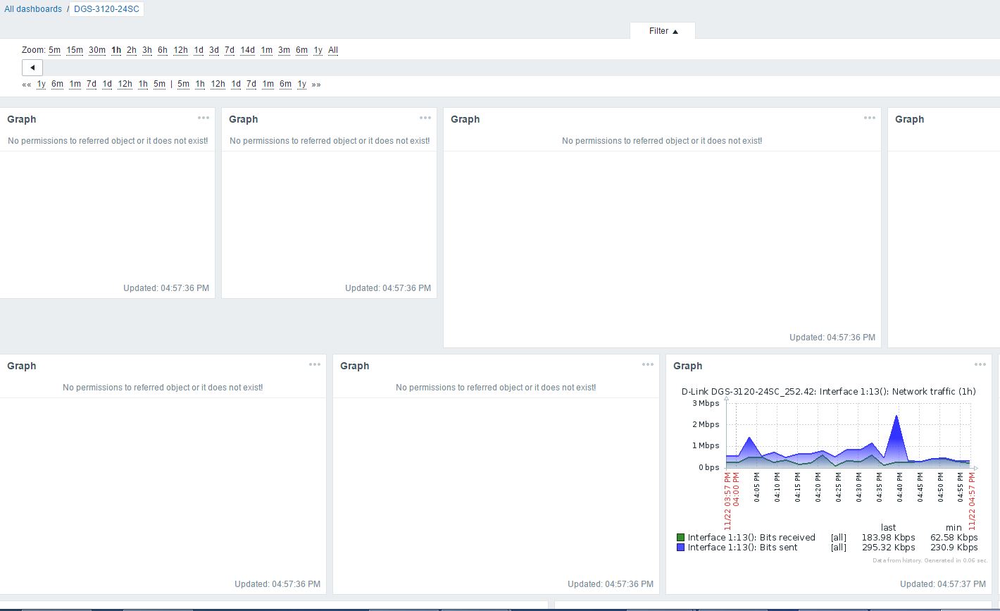 Hi there! I have Zabbix 3.4.4 on brand ubuntu appliance. Everithing was good for a while, a added some hosts, templates, got graphics, tuned dashboards...One day a got error "No permissions to referred object or it does not exist!" on every dashboard, but! some graphics shows good, some - gone, on same and different hosts, no matter. Attached a screen. Need some help!