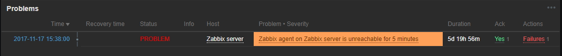 I set up Zabbix Server 3.4.2 and Zabbix Agent on the same Ubuntu 16.04 server and since then I have been getting "Zabbix agent on Zabbix server is unreachable for 5 minutes" on the dashboard: