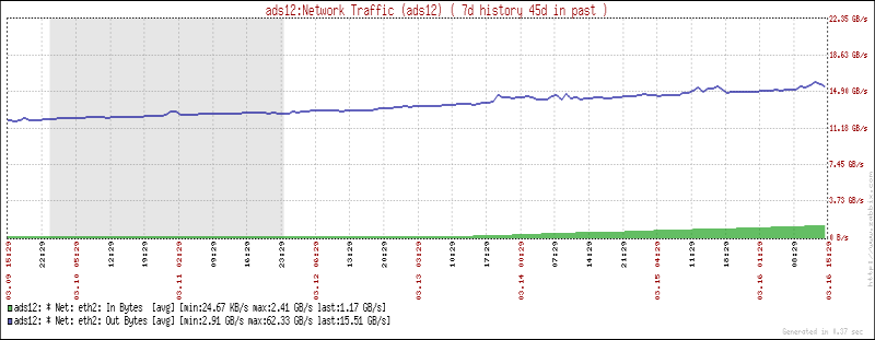 Finally, Chart 2a shows the last month of traffic with my outgoing traffic being listed as almost 30GB/s