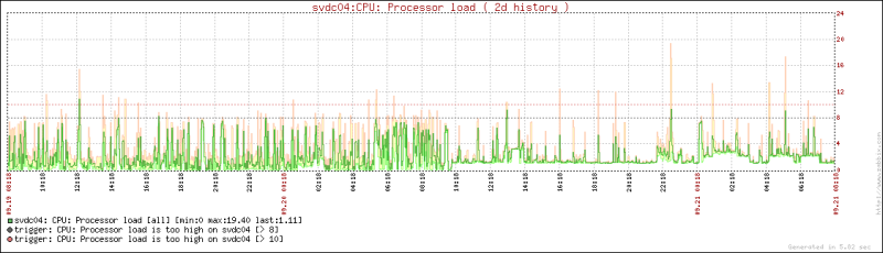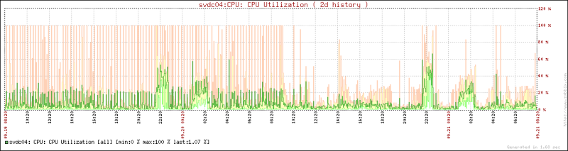 Attached is a graph of cpu load and util showing a 48 hour time span. I stopped monitoring the event logs at about 9:30 AM yesterday (which is just about the center of each graph) and you can clearly see a massive drop in the number of cpu load and utilization spikes. I saw the same results on three other servers that I tested this on. This only seems to be an issue with servers that are CPU bound (i.e. they don't have enough cpu power available) but you can see a "spike" in activity on all servers that do event log monitoring.