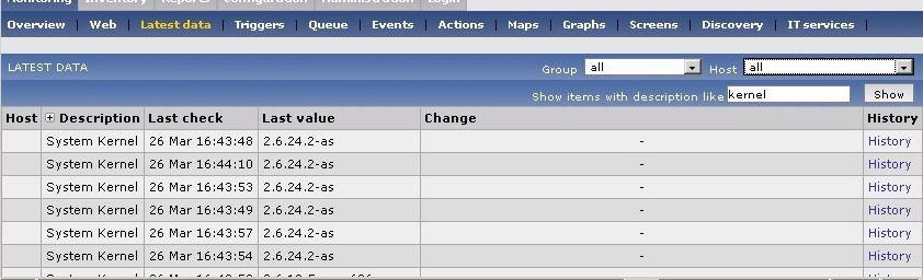 I recently upgraded our 1.4.2 zabbix server(centos4,64-bit) to 1.4.4. Since that time, the Host column under the Latest Data form are all blank. Looking at the page source, it only shows nbsp for the data(no Hosts names). Looking at other sections of the Zabbix GUI(Configuration/Hosts) show all of the hostnames. If I query the postgres db all of the machine names are listed.