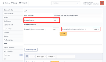 - Set the Enable Rest API and Enable login with external token options to Yes and click the Save button.