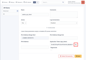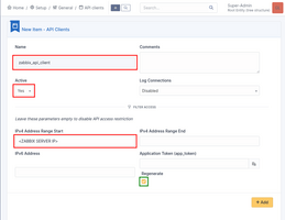 - For security reasons, you may want to restrict the API client to the IP address of Zabbix server and/or create an additional application token (will be generated by default; you can uncheck the Regenerate checkbox if you don't want to use it).