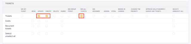 - In the Tickets section, set the Update, Create, and See all tickets permissions.