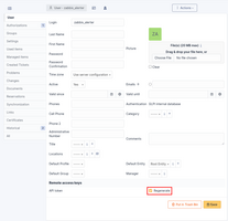 - Open the profile of the created user and check the Regenerate checkbox of the API token option; click Save.
