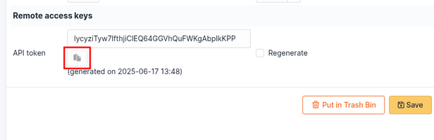 - If you've opted to create an application token, open the settings of the created API client, and then copy and save the generated application token.