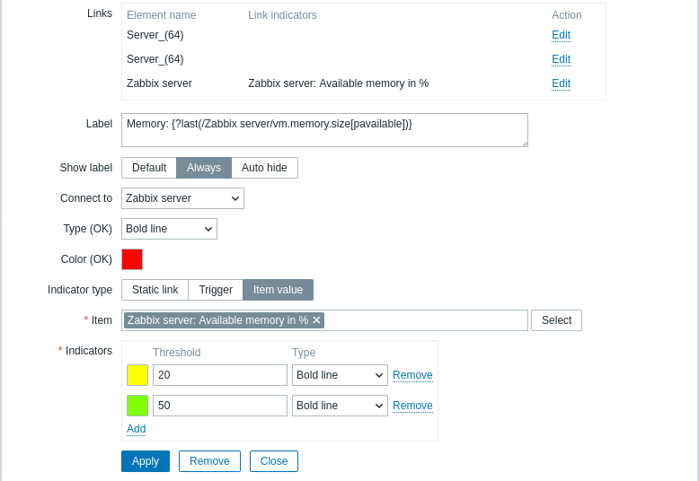 In Monitoring → Maps the respective link type and color will be displayed if the item value reaches the set threshold (for numeric data types) or matches the regular expression pattern (for text data types).