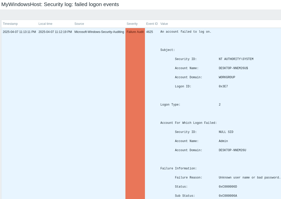 find(/MyWindowsHost/eventlog[Security,,,,4625,,skip],10m,"like","Logon failed")