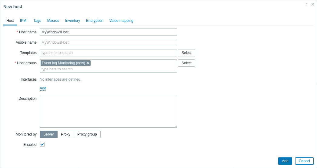 - In the Host groups field, type or select a host group (e.g., "Event log Monitoring").