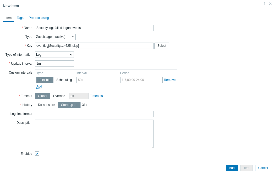 skipparameter), enter the following item key:eventlog[Security,,,,4625,,skip] - In the Type of information drop-down, select "Log".