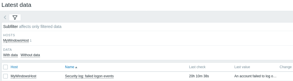 Congratulations! Zabbix is now set up to collect your Windows event logs. To verify that event logs are being collected, you can test the "Security log: failed logon events" item by logging out of your Windows account and attempting to log in using incorrect credentials.